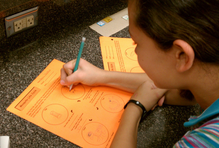 The Kindergarten Mosquito Program is designed to introduce our youngest learners to life science. This science-readiness lesson uses the characteristics of a mosquito to teach students about basic attributes of insects, including an insect’s life cycle. Students create a model of a mosquito to take home that highlights its two wings, six legs, two antennae, and three main body segments. The classroom is also provided with a sample of living mosquito larvae in an enclosed container, allowing students to see what the little wigglers look like first hand.